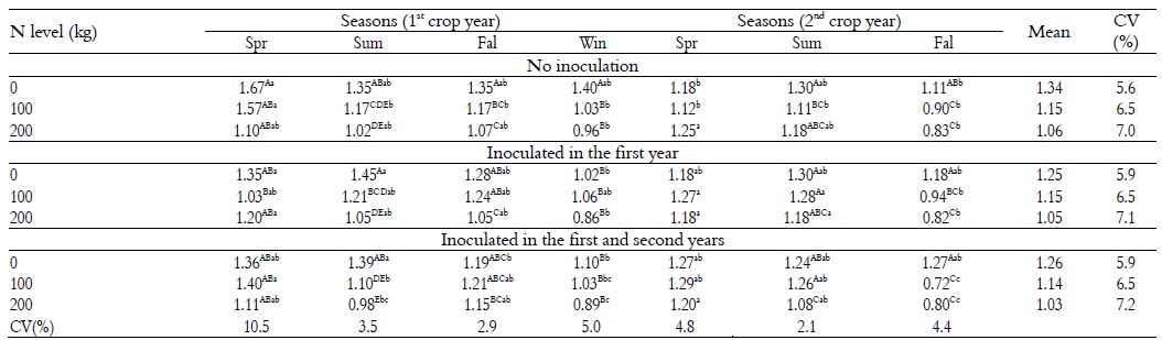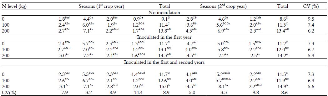 In the comparison between the pastures inoculated only in the first year and those inoculated in the first and second years, there was no difference between them considering the same levels of N. This indicates that the bacteria remained in the system, without the need to reapply inoculation in the second crop year.