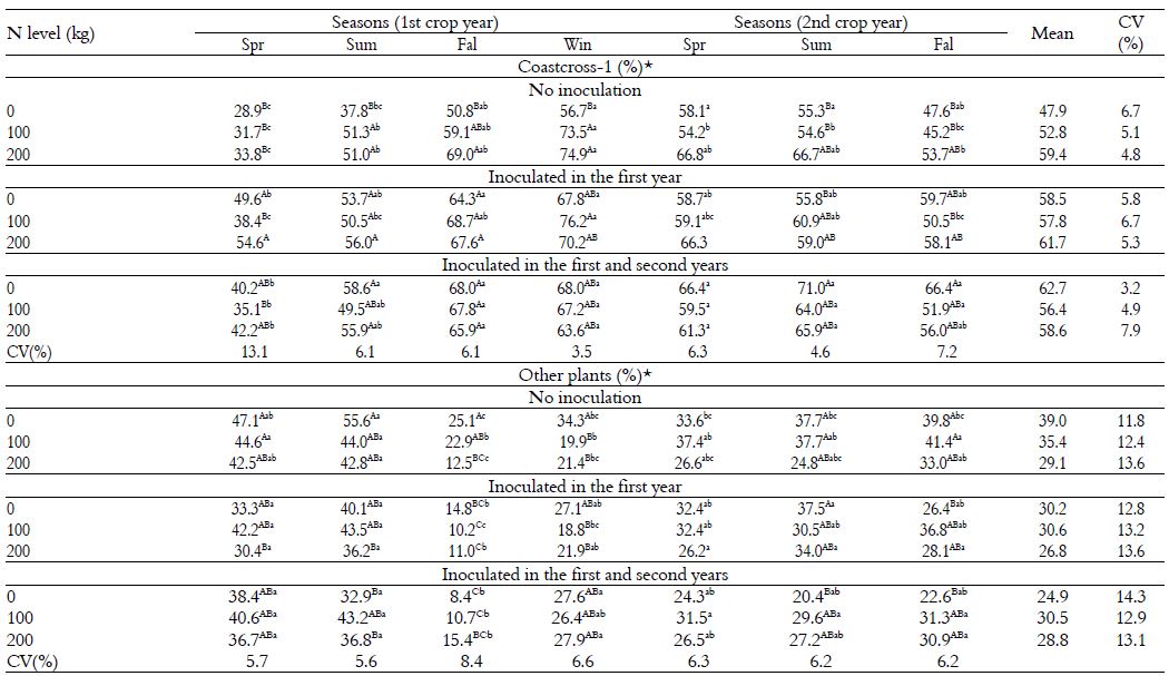 In the comparison of the participation of Coastcross-1 between the seasons, no differences were detected (p ≥ 0.05) only at the level of 200 kg ha-1 year-1 N, when inoculated only in the first year, demonstrating the regularity in the participation of Coastcross-1 in this pasture, averaging 61.7%. For the pastures that were inoculated in the two years, at all levels of N, there were generally lower participation of Coastcross-1 in the season of its implantation, with subsequent increase and stabilization of the grass presence. The greatest variability occurred in non-inoculated pastures.