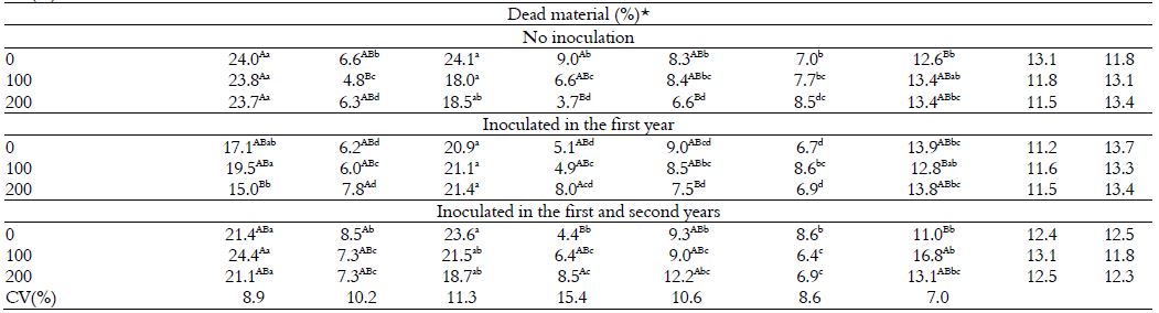 Regarding the presence of dead material (Table 3), there was an irregularity in the observed responses, not clearly related to inoculation or N levels. During the two years of evaluation, the highest values were recorded in the spring and fall of the first crop year. This behavior can be explained, in the spring of the first crop year, by the high participation of ryegrass, which when reached the end of its vegetative period, collaborated to increase the participation of dead material in the pastures and, in the fall of the first crop year, by the senescence of spontaneous growth species of the summer cycle, which had high participation in pasture in this season.