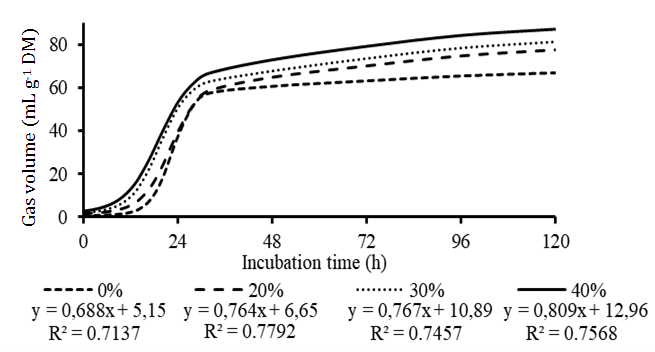 Cumulative gas production was influenced by the addition of maniçoba (Figure 1), and the highest values were observed in silage with a higher proportion of maniçoba, indicating potentially more degradation by faster fermentation of NFC and slower of fiber fraction.