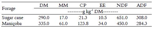 A chemical-bromatological analysis of the sugar cane and maniçoba before ensiling was performed according to the methods described below (Table 1).