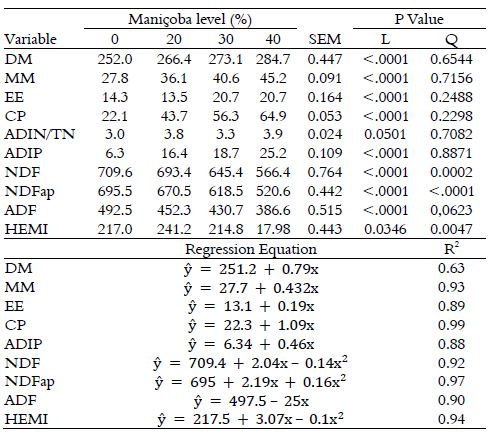 The highest levels of NDFap (702.4 g kg-1 DM) were estimated by the regression equation for silage with 6.7% maniçoba, and this variable may have influenced the content of hemicellulose, which in turn showed its highest value (24.0 g kg-1 DM) with 15.2% maniçoba.