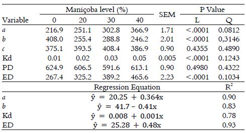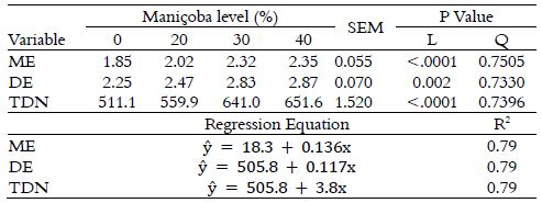 The levels of digestible energy (DE), metabolizable energy (ME), and total digestible nutrients (TDN) increased linearly by 0.013%, 0.017%, and 0.378%, respectively, for each percentage unit of maniçoba addition (Table 5).