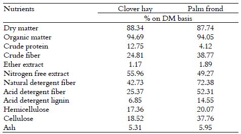 Table 1 shows the chemical composition of clover hay and palm fronds. The results indicated that content of clover hay and palm fronds are similar in DM and OM. While, the differences between clover hay and date fronds are showed in crude protein and fiber contents, palm fronds showed higher values in fiber contents but lower in CP than found in clover hay.