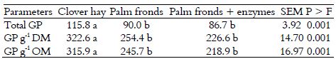 Table 2 shows gas production. The results showed that palm fronds and supplemented palm fronds with fibrolytic enzymes decreased (p < 0.05) total gas production, adding fibrolytic enzymes recorded the lowest values of total gas production, GP g-1 DM and GP g-1 OM (86.7, 226.6 and 218.9 mL respectively) followed by palm fronds (90.0, 254.4 and 245.7 mL, respectively) compared with clover hay (115.8, 322.6 and 315.9 mL, respectively). The current finding showed a reduction in gas production and GP per each gram of DM or OM as using palm fronds only or with adding fibrolytic enzymes. It is well known that there is negative correlation between gas production and cell wall contents (NDF and ADF) which tend to reduce the microbial activity (De Boever, Aerts, Vanacker, & De Brabander, 2005). Different studies stated that addition of fibrolytic enzymes reduced methane production (Hernández et al., 2017; Ahmed et al., 2016; Salem et al., 2015).