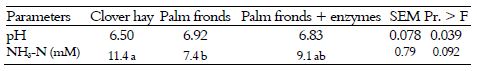 The effect of different treatments on rumen pH and NH3-N are presented in Table 3. The results showed that even palm fronds only or supplemented with fibrolytic enzymes decreased (p < 0.05) rumen NH3-N concentrations compared with clover hay. These reductions of NH3-N concentrations are reflecting of the low contents of crude protein as shown in chemical composition (Table 1). Also, might reflect that using palm fronds only or with adding fibrolytic enzymes affected on microbial biomass of rumen microbes which clear as microbial protein (Table 4).