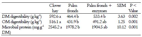 Evaluating palm frond only or supplemented with fibrolytic enzymes on ruminal in vitro digestibility are shown in table (4). Results showed that clover hay and adding fibrolytic enzymes to palm fronds decreased (p < 0.05) the DM digestibility as compared with palm fronds only. But there were no differences between palm fronds only or palm fronds supplemented with fibrolytic enzymes on OM digestibility and microbial protein, but there was a decrease in OM digestibility and microbial protein in palm fronds compared with control. The results of dry matter and organic matter digestibility showed a reduction in palm fronds either with or without fibrolytic enzymes compared with clover hay. The low digestibility coefficients of DM and OM are most probably due to the high fiber content of palm fronds (Mahgoub, Kadim, Al-Busaidi, Annamalai, & Al-Saqri, 2007). Results showed that palm fronds with or without fibrolytic enzymes reduced (p < 0.05) microbial protein compared with clover hay. These findings might due to reduction of palm fronds CP contents and high contents of fibers which reflected on ruminal fermentation and releasing ammonia which is necessary component to microbial biomass growth.