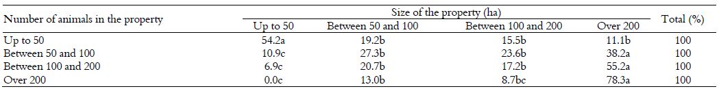 This percentage increases to 73.4% if considered properties with up to 100 ha. Therefore, there is a direct relationship between the area of the property and the number of animals of the herd, but with the prevalence of the exploitation of few animals in small areas.