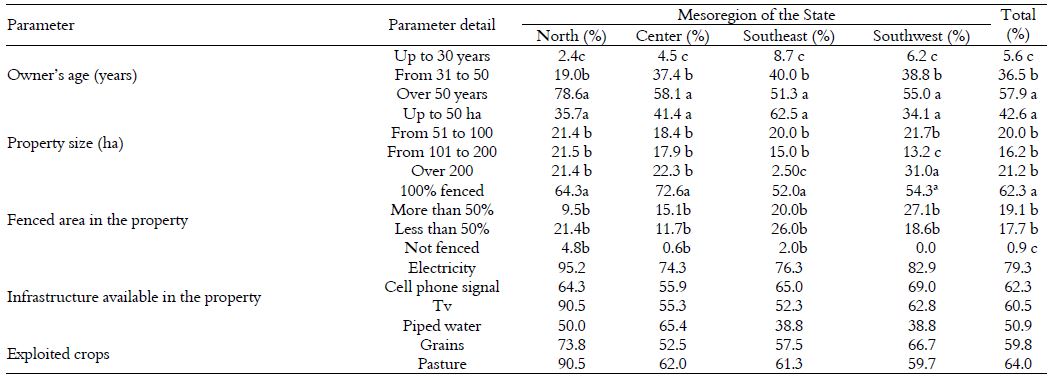 Regarding the age of the cattle breeder, it can be observed that cattle breeding does not show signs of renewal with the inclusion of young people, since the number of breeders interviewed who reported being over 50 years old corresponds to 57.9% of the total, with significant difference between mesoregions (p < 0.05), with emphasis on the north of the State, which presented a value of 78.6%, while in the southeast mesoregion, the problem is less severe, where 40.0% is between 31 and 50 years (Table 3).