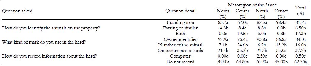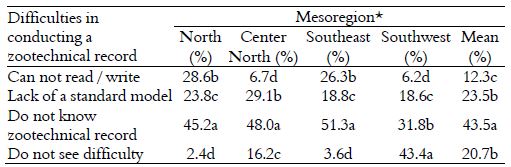 It is confirmed that more than half of the interviewees do not have the practice of recording data on health or zootechnical control in the herd in each mesoregion (Table 4), with the exception of breeders in the southwest of the state, which is worrisome, since the zootechnical record is the basis for animal tracing, a legal requirement of the Ministry of Agriculture that is difficult to be met throughout the country (Barcellos, Abicht, Brandão, Canozzi, & Collares, 2012).