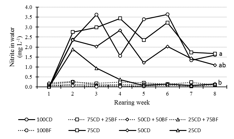 Intensive fish culture is prone to cause deterioration in water quality due to the accumulation of nitrogenous compounds such as ammonia, nitrite and nitrate in water (Crab et al., 2007). The nitrite produces meta-hemoglobin in fish blood, and this form cannot transport O2 to the tissues (Lin & Chen, 2003). Except by 25CD, the nitrite concentrations in water were lower in the bioflocs tanks than in the artificial diet tanks (p < 0.05; Figure 1). Those results are supported by Azim and Little (2008) and Long et al. (2015) who also observed a nitrite decrease in tilapia BFT tanks. Nitrification regularly removes nitrite from water. Bioflocs, however, could remove more nitrite than nitrifying bacteria because heterotrophic bacteria can grow up to seven times faster than the latter ones (Hargreaves, 2006). The massive growth of heterotrophic bacteria generally inhibits the nitrification process as the main nitrite drain (Long et al., 2015). Furthermore, less nitrite would be produced by nitrification in bioflocs-rich tanks.