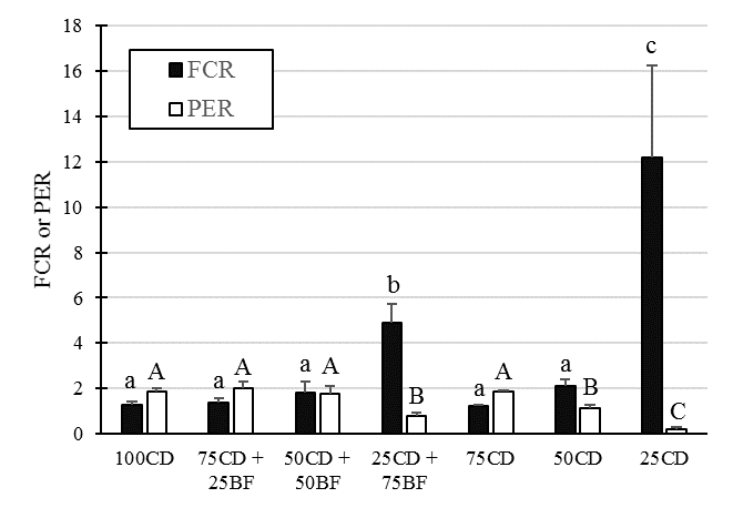 The food conversion ratio (FCR) was deteriorated as the level of substitution of commercial diet by wet bioflocs biomass increased. However, there was significance only at the 75% substitution level, i.e., for the 25CD + 75BF treatment (Figure 2). The worsening of FCR was much higher for the 25CD than for 25CD + 75BF. A similar trend was observed for PER: the higher the substitution level of commercial diet for bioflocs, the lower the protein efficiency, which became significant at 75% substitution (25CD + 75BF). PER was significantly better at 50CD + 50B, than at 50CD, which suggests the use of bioflocs protein for fish growth.