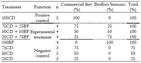 The experimental fish were fed on different combinations of artificial food, i.e., dry commercial diets, and natural food, i.e., wet bioflocs biomass (Table 1). The commercial diets used sequentially over the study were the following: 1 - powdered diet with 49% CP (Initial Fri-Aqua, Trouw Nutrition, Nutreco Brazil); 2 - pelletized 1.0 mm diet with 43% CP (Fingerling Fri-Aqua, Trouw Nutrition, Nutreco Brazil); 3 - pelletized 2 - 4 mm diet with 36% CP (Juvenile Fri-Aqua, Trouw Nutrition, Nutreco Brazil). As the input of dry diet was reduced, the input of wet bioflocs biomass was proportionally increased on a dry matter basis. In the 100CD positive control, the fish just received commercial diets as food throughout the study. In the 100BF experimental treatment, the fish just received wet bioflocs biomass as food over the experiment. In the 75CD + 25BF, 50CD + 50BF and 25CD + 75BF experimental diets, there were mixed allowances of commercial diet and wet bioflocs biomass, in different proportions, depending on the treatment. In the 75CD, 50CD and 25CD negative controls, the fish received the same amount of commercial diet delivered to the treatments 75CD + 25BF, 50CD + 50BF and 25CD + 75BF, respectively (Table 1).