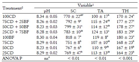 The total alkalinity of water was strengthened because less artificial diet was delivered to the tanks (Table 2). There was probably less CO2 in tanks with lower feeding allowances and free CO2 reacts with the molecule of water and it forms carbonic acid that reduces alkalinity (Boyd, Tucker, & Somridhivej, 2016). Besides, the total alkalinity of water was higher in tanks that received only bioflocs biomass (100BF) than in the tanks that received just artificial diet (100CD). Alkalinity consumption by nitrifying bacteria is expected to be higher than by heterotrophic ones (Ebeling, Timmons, & Bisogni, 2006). The nitrifying activity was probably more intense in the non-bioflocs tanks (75CD, 50CD and 25 CD) than in their counterparts (75CD + 25BF, 50CD + 50BF and 25CD + 75BF, respectively). Therefore, the alkalinity requirement was higher in the former tanks than in the latter ones (Table 2). Those results suggest that the partial replacement of artificial diets by wet bioflocs biomass might reduce the impact of feeding management on the total alkalinity of the Nile tilapia’s fish tanks. This replacement would be an interesting management to achieve better water quality, if the growth performance of the fish had not been affected by it (Table 4).