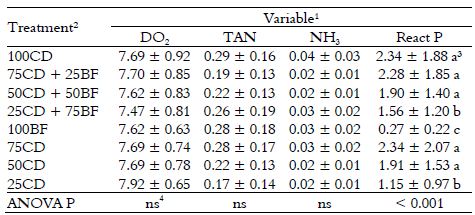 Higher concentrations of reactive phosphorus in water were found in tanks with increased artificial diet allowances (Table 3). Just a small percentage of the total phosphorus that enters the tank via feeding is retrieved by the fish biomass, because there is a significant loss of phosphorus to water through fish excretion (Cyrino et al., 2010). Schneider, Sereti, Machiels, Eding, and Verreth (2006) have stated that heterotrophic bacteria associated with bioflocs could absorb phosphates from water. Those last authors observed that increased bioflocs biomass lowered the concentrations of orthophosphate in water. That, however, has not happened in the present work, since there was no significant effect on reactive phosphorus between the experimental treatments and their respective negative controls (Table 3). However, while Schneider et al. (2006) used autochthonous bioflocs, we used allochthonous bioflocs, which were produced in one separate tank. Therefore, allochthonous bioflocs seem to be inferior to autochthonous bioflocs as cleaning agents of the culture water.