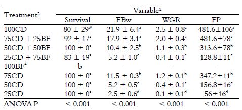 The use of high-protein diets might not be necessary when there is plenty of natural food into the culture tanks, such as bioflocs (Vinatea et al., 2018). Therefore, bioflocs could reduce the required protein in aquaculture diets and, accordingly, reduce production costs. Although the total substitution of artificial diets by bioflocs leads to growth impairment, even minor substitutions could bring a significant reduction in the feeding cost, since the acquisition of artificial diets is a major expense (Ahmad, Rani, Verma, & Maqsood, 2017). All fish from 100BF died before the fifth rearing week (Table 4). This result pointed out that bioflocs had a lower nutritional value than the complete commercial diets used. Wasielesky, Atwood, Stokes, and Browdy (2006) have said that it is inappropriate to feed shrimp solely on bioflocs, regardless the bioflocs’ crude protein level obtained. Those authors have considered as ideal a combination between artificial diet and bioflocs biomass. Wasielesky et al. (2006), however, have not declared which proportions of artificial diets and bioflocs biomass should be used.