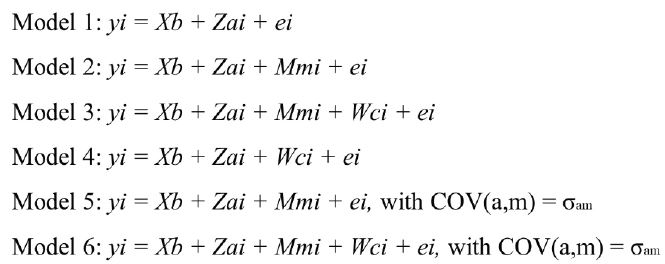 The components of (co)variance and genetic parameters, for the trait in question, were estimated using six different animal models, shown in Figure 1.