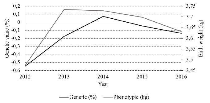 Genetic and phenotypic trends were analyzed visually by the interpretation of the graph obtained by Office Excel software. Thus, the genetic trends were calculated by the average genetic value per year, expressed as a percentage of the phenotypic average of the respective year. The genetic gain was calculated by the difference in the genetic value of 2016 and 2012. The phenotypic trends were calculated by the average birth weight in each year and their progress was calculated by the difference in the average weight in 2016 and the average weight in 2012.