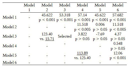 To determine the model that best fit the data, the comparisons were performed by the likelihood ratio test (LRT). The model with the highest number of parameters (alternative model) was compared with the model with the lowest number of parameters (null model). The LRT assumes a chi-square distribution and its degrees of freedom are calculated by the difference in the number of parameters between the alternative model and the null model. The statistical significance for the models was established at the probability level of 5%, or p ≤ 0.05. The LRT (Hogg & Craig, 1995) was obtained by the formula: LRT = - 2x (Ls-Lc). Where Ls is the logarithm of the maximum likelihood function (Log L) of the null model and Lc is the Log L of the alternative model.