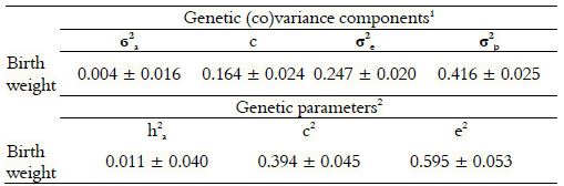The analyses to estimate the (co)variance components and the genetic parameters were performed using the restricted maximum likelihood method (REML) under animal model, considering the birth weight, using the WOMBAT software (Meyer, 2012).