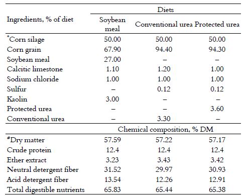 For a successful use of non-protein nitrogen for ruminants it is necessary that they have excellent synchronization with fermentable carbohydrates that come from other components of the diet. The main source of carbohydrate used in Brazilian feedlot systems is corn (Oliveira & Millen, 2014). However, the way this grain is supplied is still quite discussed. Processing such as grinding is used to increase the surface area of the grains to facilitate digestive processes. Vargas Junior, Sanchez, Wechsler, Bianchini, and Oliveira (2008) provided whole or ground corn for calves without changes in intake and performance. Benedeti et al. (2014) found decreasing dry matter intake when replacing soybean meal by protected urea and attributed it to the high digestibility of the finely ground corn used in the diet, which would not have been accompanied by the assimilation of nitrogen in the rumen, which was released gradually.