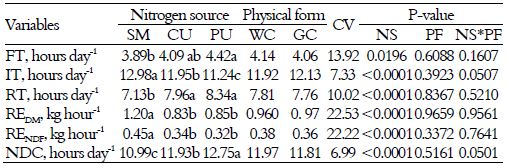 There was no interaction between the nitrogen sources and the physical forms of the corn grain for any of the variables related to the ingestive behavior (p > 0.05) that are listed in table 3. Times spent in feeding, idle and rumination were influenced by nitrogen sources in the diet. Protected urea-fed steers spent more time in feeding than steers fed diets with soybean meal (p < 0.05); while the diet with conventional urea did not differ from the others.
