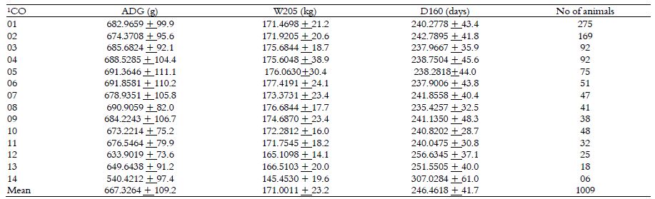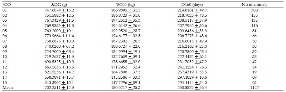 The means and standard deviations of the average daily gain (ADG), weight at 205 days (P205) and days to reach 160 kg (D160) variables of the calves and heifers were estimated as a function of the matrices’ calving orders. For the ADG and W205 variables, the best performance was found in the offspring of sixth-calving cows, while the poorest was observed in the offspring of 14th-calving cows for both males and females (Tables 1 and 2).
