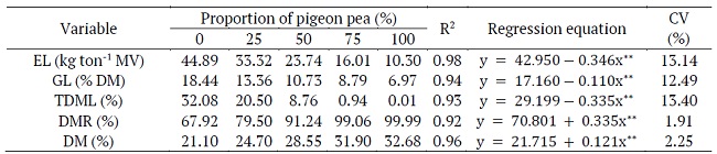 Adding pigeon pea to the sugarcane silage for EL, GL and TDML showed an effect that decreased linearly, while DMR and DM increased linearly (Table 1). The decreases in EL with the increased addition of pigeon pea to the silage were mainly due to the decreases in DM content. Adding 50% pigeon pea promoted a 35% increase in DM and a 53% decrease in EL. According to Ribeiro et al. (2010), nutrients are lost with the effluent when ensiling sugarcane, and these nutrients are transported to the bottom of the silo. The decrease in GL with the increased addition of pigeon pea in sugarcane silage may be related to the decreased soluble carbohydrate content due to increased NDF and ADF. The increased fiber content decreased the amount of substrate available for the yeasts promoting alcoholic fermentation that produces CO2 and volatilizes alcohol (Balieiro Neto et al., 2007; Lopes & Evangelista, 2010).