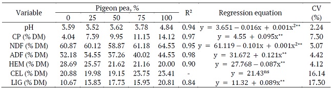 The increased pigeon pea proportions in the sugarcane silage promoted changes in the pH values and CP, NDF, ADF, HEM and LIG contents (Table 2). The CEL content did not change. The pH value showed a quadratic response ranging from 3.59 to 4.84 for the proportions of 0 to 100% pigeon pea in the silage, respectively. The proportion of 75% pigeon pea yielded a pH within the range of 3.8 to 4.2, which is considered ideal for good quality silage (McDonald, 1981). The other proportions presented pH values near this range. The NDF content presented a quadratic response ranging from 58.87 to 64.53% for the proportions of 50 to 100% pigeon pea in the silage.