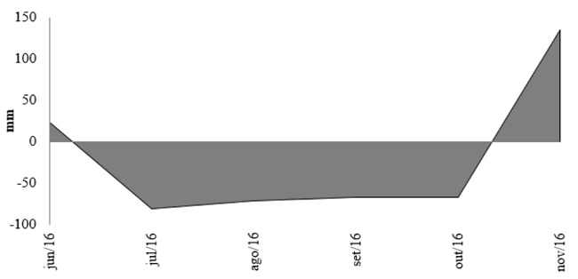 Crop water balance was obtained from June to November 2016 (Figure 2), according to the proposed equations by Camargo and Camargo (2000).