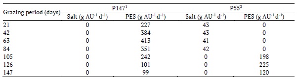 The mean salt intake and PES of the P147 and P55 treatments (Table 2) were 0 and 260 g animal unit (AU)-1 day-1, and 42 and 181 g AU-1 day-1, respectively, and were close to the values reported by Malafaia et al. (2007).