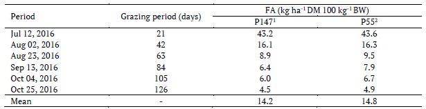 Garcia, Euclides, Alcalde, Difante, and Medeiros (2014) stated that if the forage allowance is similar between treatments, it will not affect forage intake, grazing time, or animal performance. This was observed in the present study, as there was no effect of treatment on the FM (Table 4). However, as previously discussed, the increased forage allowance in the present study resulted in changes in leaf mass as a function of the treatments. According to Janusckiewicz, Raposo, Morgado, Reis, and Ruggieri (2016), tropical grasses provide ruminants with opportunities for selection as they present variation in nutrient availability; this may explain the observed results. This variation was observed in the CP and NDF content with both treatments. The P147 treatment resulted in 58, 43, and 50 g kg-1 of CP and 728, 796, and 717 g kg-1 of NDF after 21, 105, and 147 days of grazing, respectively. For the P55 treatment, CP levels were 52, 42, and 50 g kg-1 and the NDF content was 735, 799, and 714 g kg-1 after 21, 105, and 147 days of grazing, respectively.