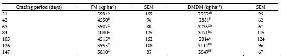 An effect (p < 0.0001) of grazing period on FM and DMDM was observed (Table 4). FM decreased by 36.3% from the beginning (21 days of grazing) to the end (147 days of grazing) of the evaluation period. These results are consistent with the findings of Ítavo et al. (2016), who evaluated non-protein nitrogen sources for Nellore steers recreated in the deferred pastures of Urochloa brizantha Syn. ‘MG-4’. In this study, the authors observed a decrease in FM from 13,069 to 3634 kg ha-1 between July and October.