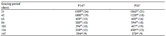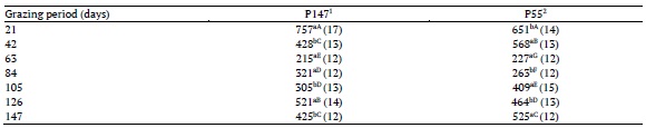 There was an interaction (p < 0.0001) between PES and grazing periods for leaf blade dry mass (Table 5). The highest and lowest LBDM were observed after 21 and 63 days of grazing, respectively, both for P147. From 21 to 63 days of grazing, there was a decrease in LBDM; however, there was increase for this variable was observed at 84 days. After 126 days, the LBDM was higher than on the previous evaluation dates. However, at 147 days, the LBDM was lower than previous one (126 days) and similar to that of 42 days of grazing. The highest and lowest values for LBDM were observed on Jul 07 and Aug 23, respectively, for P55. However, there was a decrease in LBDM values from 21 to 84 days, followed by an increase up to 147 days of grazing.
