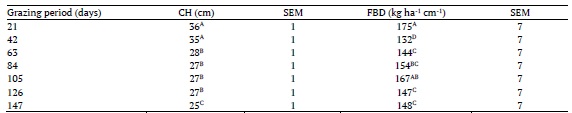 The highest FBD occurred after 21 days and the lowest after 42 days of grazing. This difference can be explained by the significant reduction in FM (Table 4), although there was no difference in CH during these periods. After 63 days of grazing, there was an increase in FBD due to a reduction in the average height of the pastures (from 35 to 28 cm). From this date, the FBD values increased up to 105 days of grazing. This type of modification in the relationship between FM and CH, increased the FBD (Santos, Fonseca, Balbino, Monnerat, & Silva, 2009). During the last two grazing periods (126 and 147 days), the FBD values were similar (147 and 148 kg ha-1 cm-1). In addition, the mean FBD was 152 kg ha-1 cm-1, higher than the 106 kg ha-1 cm-1 obtained by Teixeira et al. (2011) when canopies of U. decumbens were grazed after stockpiling of 95 days. The high FBD observed can be explained by the reduced stocking rate (1.56 AU ha-1).