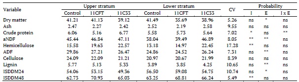 There was significant interaction between inoculant and silo strata for the crude protein content of the different silages, in which the silage of the upper stratum with 11C33 inoculant showed the highest value, and the silage of the same stratum with 11CFT inoculant had the lowest value (6.8 and 5.2%, respectively). It is possible to infer that the crude protein content of the silage suffers greater interference from the use of bacterial inoculants according to the stratum of the silo in which the silage is found. The similarity in the protein content between the strata of the silo is fundamental (Marquardt, Jobim, Bueno, & Ribeiro, 2017), mainly in properties that use small amounts of silage daily and do not have mixers.