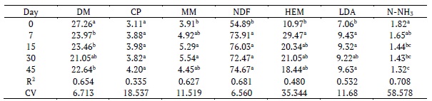 Hemicellulose is an important digestible fraction in ruminant feed and can be calculated by the difference between the levels of NDF and ADF. It ranged from 11.0% in DM at time 0, and 29.5% on the 7th day, and then there were decreases of its content. This may occur due to degradation by enzymes and acid hydrolysis from the plant.