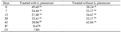 In this study the nutritional composition showed no significant statistical difference (p ≤ 0.05) when comparing the treatment with the inoculation Lactobacillus plantarum LPBR01 and the control treatment, but there was a difference according to the days of fermentation, as shown in Table 1.