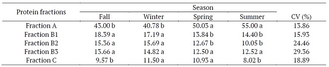 It can be observed in table 1 an increase of 23.56% of the fraction C in winter in relation to the summer and fall, which may be related to the development stages of the plant. Even with the use of irrigation in these seasons, forage production was lower than in the other seasons, producing 49% in relation to summer and 33.2% in relation to spring and fall. Also, in these periods, in the same experimental area, Brandstetter et al. (2018) observed a greater elongation of stems, where the leaf: stem ratio declines rapidly, because in addition to the higher stem growth, leaf appearance (fundamental for dry mass production) was reduced due to the lower quantity and quality of the light that reaches the inside of the canopy. As a result, there was an increase in fractions C, which also reflected lower milk yield (Brandstetter et al., 2018). The results found for fraction C herein (Table 1) are lower than those observed by Branco et al. (2012), who evaluated the chemical composition and fractionation of crude protein of the Coastcross grass, and reported values of 14.73, 14.98 and 15.01% for winter, spring and summer, respectively. The lower values of fraction C for Jiggs bermudagrass when compared to Coastcross grass, also a species of Cynodon dactylon, reinforces the fact that this forage has high potential for use in pasture systems for dairy cattle.