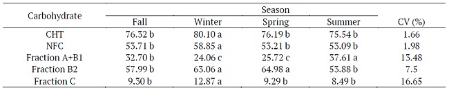 The explanation for the increase of total carbohydrates (CHT) of Jiggs bermudagrass in winter in relation to the spring, summer and fall (Table 2), is associated with the increase in structural carbohydrates and lignin, which reduces the proportion of potentially digestible nutrients, impairing the qualitative characteristics of the pasture (Velásquez et al., 2010). Further, it is important to note that the fiber present in tropical grasses represents most of the total carbohydrates of the pasture, thus the highest proportion of fibers in Jiggs bermudagrass during winter contributed to the greater content of CHT (80.10%) in this season.