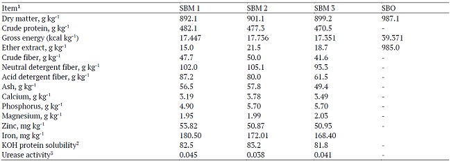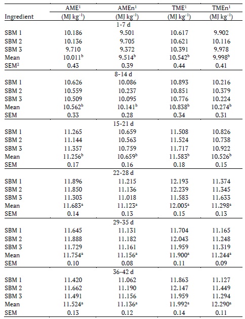In the NRC (1994), energy values of 44% and 48% for SBM crude protein are reported with an average AMEn of 10.905 MJ kg-1 DM. The average value determined in this study of 28 to 42 days was 11.014 MJ kg-1 DM.