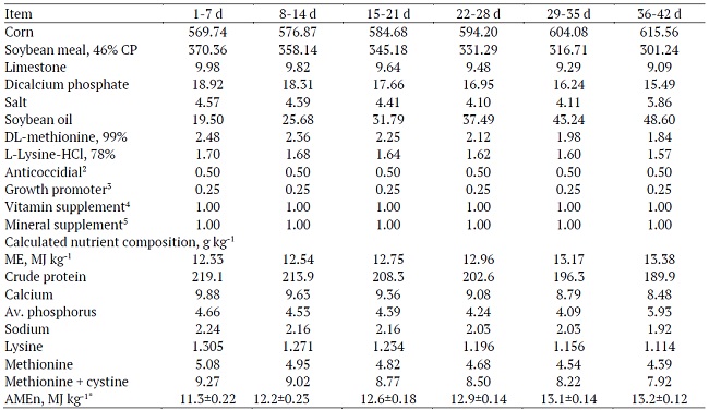 A total of 1,368 one-day-old male Ross 308 broilers chickens, obtained from a commercial hatchery, Marek´s disease vaccinated, with initial body weight (BW) of 46 ± 3 g were used in the current experiment according to the ages, being 360 birds at 1 - 7 d, 288 birds (BW of 159 g) at 8 - 14 d, 216 birds (BW of 437 g) at 15 - 21 d, 180 birds (BW of 892 g) at 22 - 28 d, 180 birds (BW of 1,483 g) at 29 - 35 d and 144 birds (BW of 2,242 g) at 36 - 42 d of age.