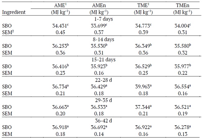 The energy values (AME, AMEn, TME and TMEn) of SBM (Table 3) and SBO (Table 4) determined to each stage, show differences (p < 0.05), as the birds grew older. The AME and AMEn values for SBM and SBO were similar to those listed in the literature (NRC, 1994; Rostagno et al., 2017) but only after the birds were 28 days old for SBM, and birds 21 days old for SBO.