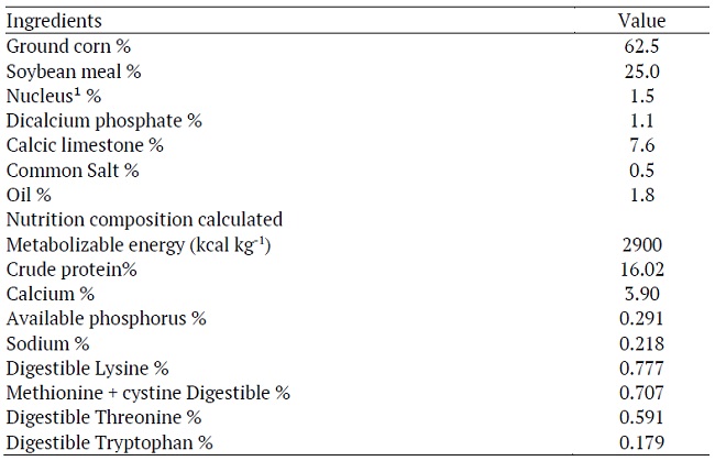 In this context, 196 Carijó laying hens with twenty four weeks of age, 2.235 kg of live weight (LW) and 69% of posture rate, were distributed in a completely randomized design with seven experimental units (EU) as replicates and fourteen birds per EU. The birds were fed with experimental diet (Table 1), which was based on corn and soybean meal, formulated as recommended by Rostagno et al. (2011) for semi-heavy birds adding, as supplementation, banana leaf in natura.