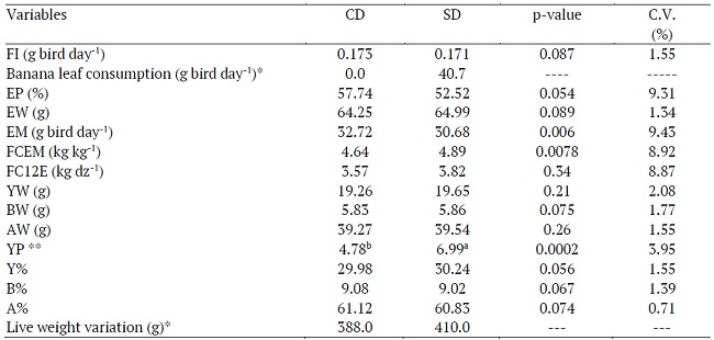 Bezerra, Sousa and Oliveira (2002) reported that banana tree nutritional composition varies according to the variety, age and plant component, and the leaf can have 12 to 13% protein in the dry matter. The banana is still rich in organic pigment beta-carotene, which can confer more orange color to yolk, also can be used as a prophylactic agent and precursor of vitamin A.