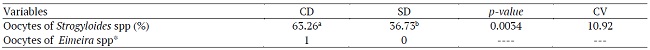In this experiment, parasites of the genus Strongyloides spp. and Eimeria spp. Were observed, also those were found in Siqueira (2016) research. Although the author has detected genres Capillaria, Heterakis, Choanotaenia, Ascaridia, Stronyloidea, Strongyloides and Eimeria protozoan, the birds showed no clinical signs of parasitic infection.