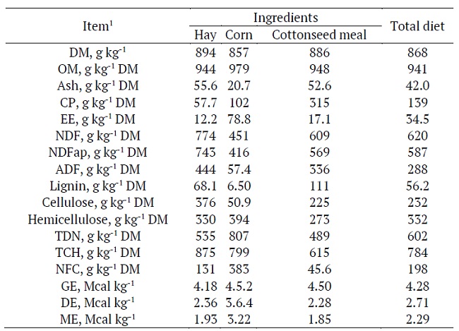 The diet and leftover samples were dried for 72h at 55°C and ground in a knife mill with a 1-mm sieve. Association Official Analytical Chemists (AOAC, 1990) methods were used for the determination of DM (Method 934.01), ash (Method 942.05), and ether extract (Method 920.39) content. Crude protein content was determined from the nitrogen value obtained by the Dumas combustion method in a Leco® FP-528 nitrogen analyzer (St. Joseph, MI, USA) and multiplied by 6.25 (Etheridge, Pesti, & Foster, 1998). Gross energy was obtained by combustion of the samples in an adiabatic calorimeter (model 6300, Parr Instrument Company, Moline, IL, USA). Neutral detergent fiber was obtained using α-amylase without the addition of sodium sulfite, according to Van Soest, Robertson, and Lewis (1991) and adapted for the Ankom 200 Fiber Analyzer (Ankom Technology, Fairport, NY, USA), and was subsequently corrected for ash and protein. Acid detergent fiber was determined using the method of Goering and Van Soest (1970), adapted for the Ankom 200 Fiber Analyzer (Ankom Technology). Lignin was determined by solubilization of cellulose in sulfuric acid according to Van Soest et al. (1991). Total digestible nutrients (TDN=DCP+2.25DFA+DND F P +DNFC−7), digestible energy [DE=(DCP/100)5.6+(DFA/100)9.4+(DNFC/100)4.2+(DNDF/100)4.2−0.3] and metabolizable energy (ME=DE0.82) were calculated according to the National Research Council (NRC, 2001), in which: DCP = digestible crude protein, DFA = digestible fatty acids, DNDF = digestible neutral detergent fiber, DNDFP = digestible neutral detergent fiber free of digestible proteins, and DNFC = digestible nonfiber carbohydrates. Non-fiber carbohydrates were determined as percentage using the following equation: 100 - (% crude protein + % ether extract + % mineral matter +% neutral detergent fiber corrected for ash and protein) according to Sniffen, O'Connor, Van Soest, Fox, and Russell (1992). Total carbohydrates were calculated as percentage: 100 - (% crude protein + % ether extract + % mineral matter).