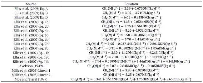 Greenhouse gas emission inventories generally use mathematical models to predict enteric methane emission from cattle. These models can be applied directly, relating nutrient intake to methane emission, or by estimating emissions from mathematical descriptions of the biochemistry of rumen fermentation (Kebreab, Clark, Wagner-Riddle, & France, 2006). Methane prediction equations are available in the literature and have been developed, among others, for simultaneous analysis in cattle and sheep (Blaxter & Clapperton, 1965), dairy cows (Mills et al., 2003), beef cattle (Ellis et al., 2009), and beef and dairy cattle in separate and combined analysis (Ellis et al., 2007; Patra, 2017). These studies were developed by meta-analysis, including published results of enteric methane emission of animals from different breeds, categories, and fed different diets.