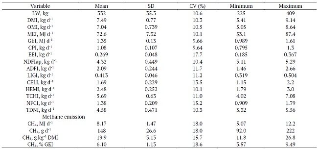 Table 3 shows the descriptive statistics of the variables analyzed. Dry matter intake (DMI) was 2.3% of live weight (LW), similar to the 2.5% reported by Corvino et al. (2011) and Hulshof et al. (2012) for Nellore steers and Nellore x Guzerat crossbreeds, respectively. Average methane emission was 8.17 MJ d-1, corresponding to approximately 20 g CH4 kg DM-1 consumed, and 6.1% GEI.
