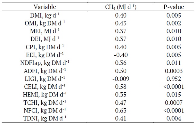 Except for lignin intake, all intake variables analyzed were positively correlated with methane emission (Table 4).